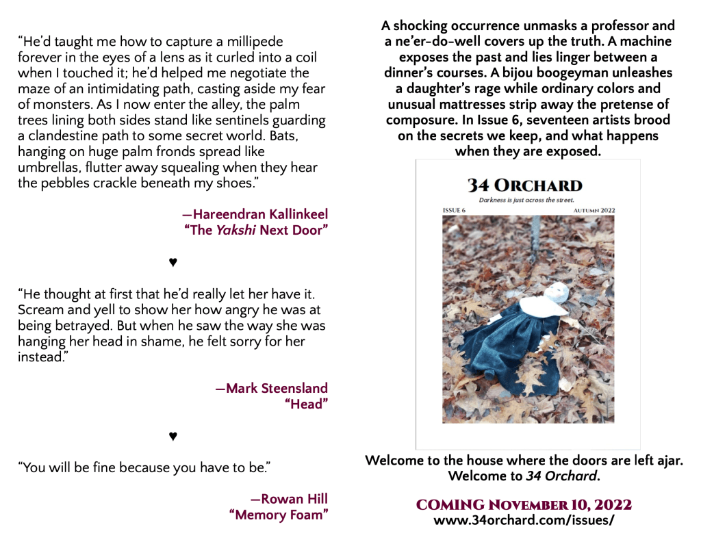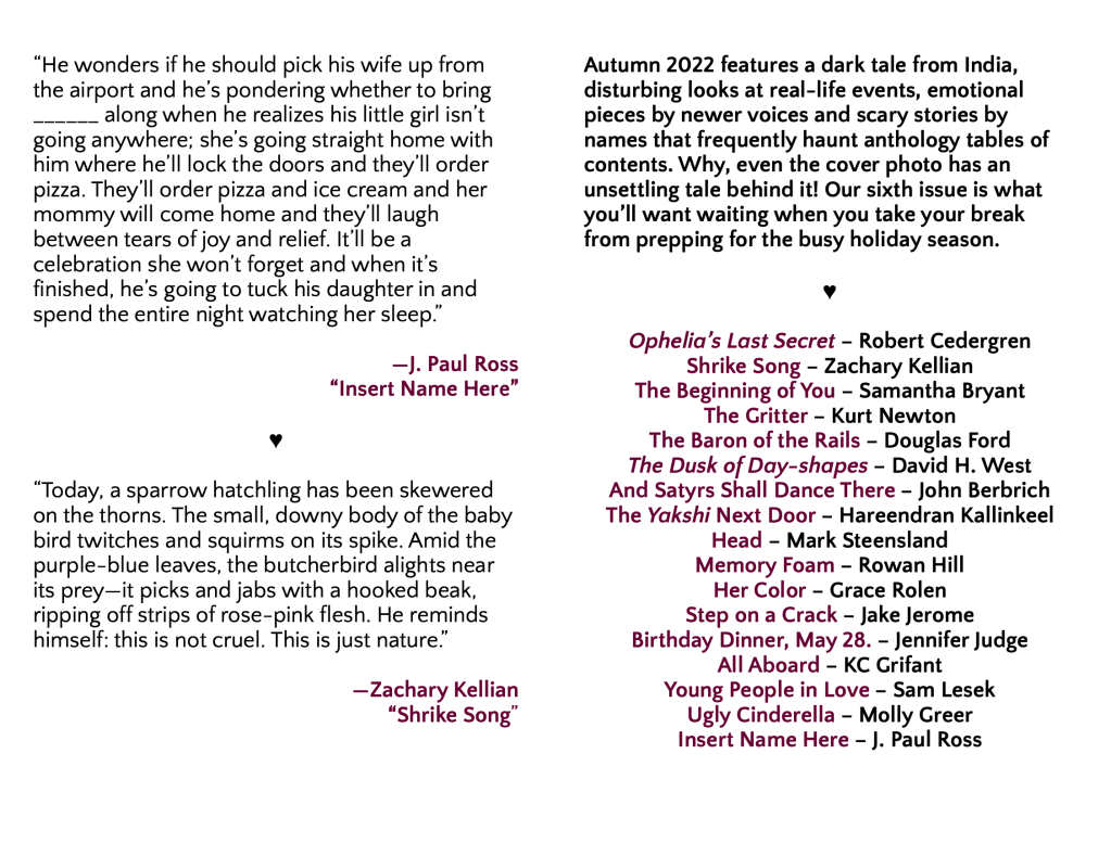 I’m still in disbelief to see my name beside so many revered authors, many of whom have been longtime personal favorites (Including the editor, Gaby Triana, who’s excellent story “Don’t You See That Cat?” I read two years ago on the sales floor at work. I admittedly should have been helping customers, but I couldn’t put it down. I also needed a break from telling every idiot who waddled into the store like a sentient Weeble Wobble to please, for the love of Christ, put your mf’n mask on.)